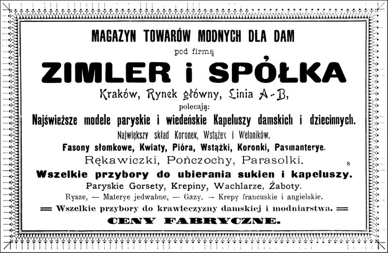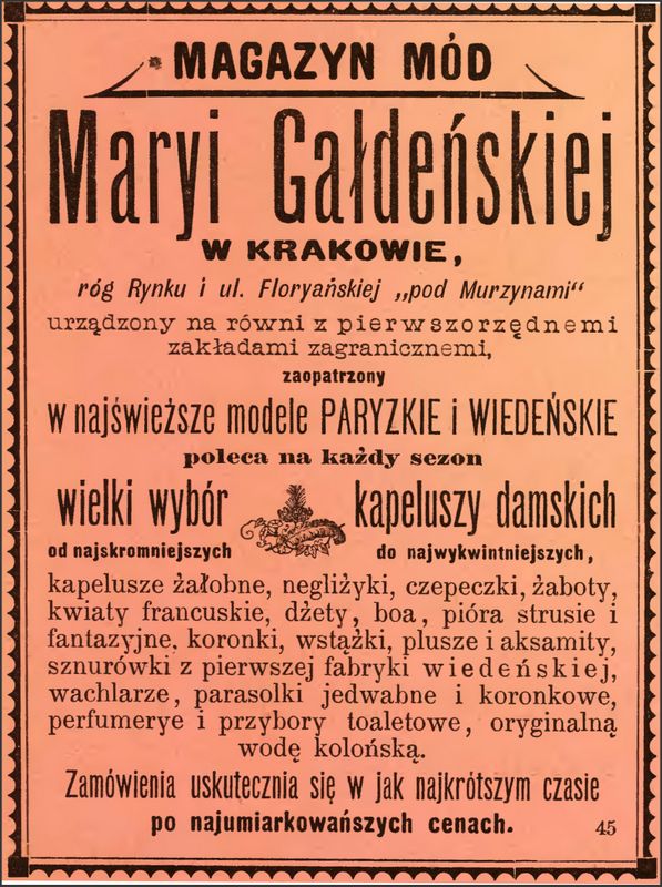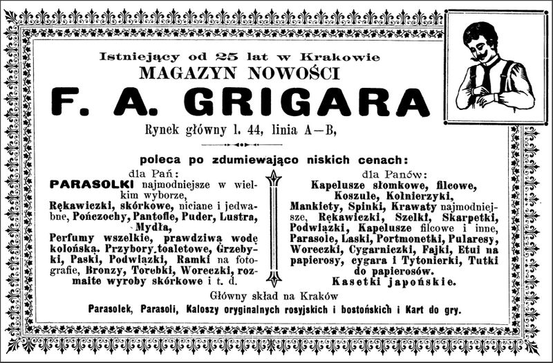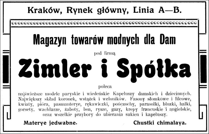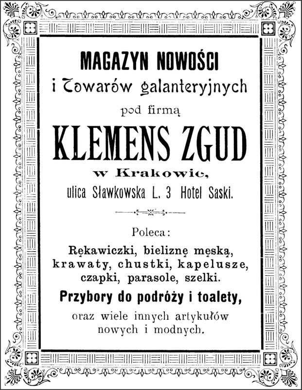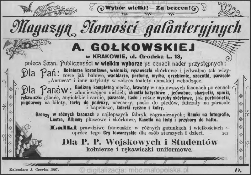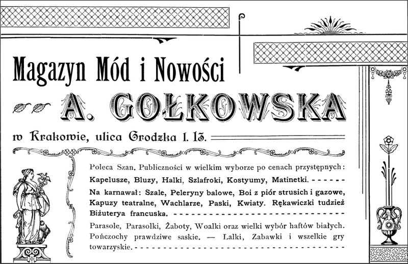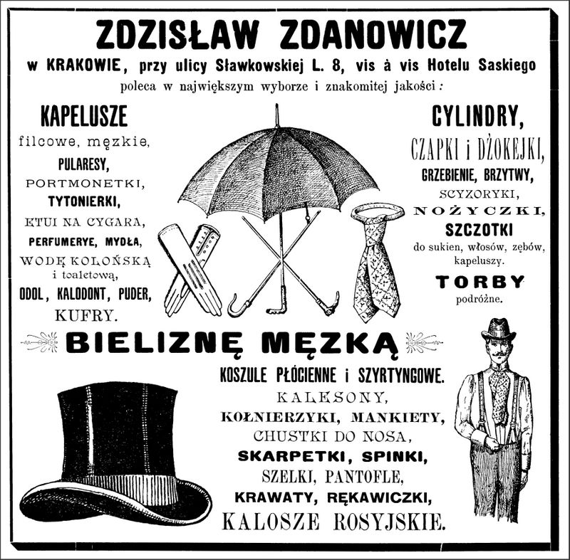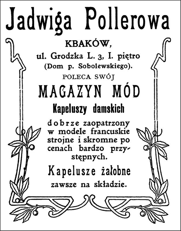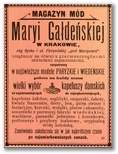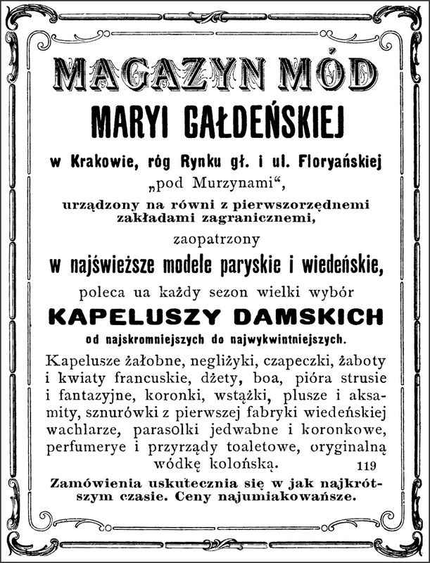 Galeria przedstawia reklamy i ogłoszenia z przełomu XIX i XX wieku zawarte w Kalendarzu Krakowskim Józefa Czecha 1886-1915. Reklamy prezentują akcesoria modowe dla pięknych dam i zacnych gentlemanów. Widoczne są na nich wszystkie dodatki, które pozwalały czuć się elegancko i dystyngowanie na krakowkisch ulicach. Wsród nich parasolki, kapelusze, czapki, rękawiczki, portmonetki.