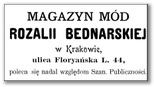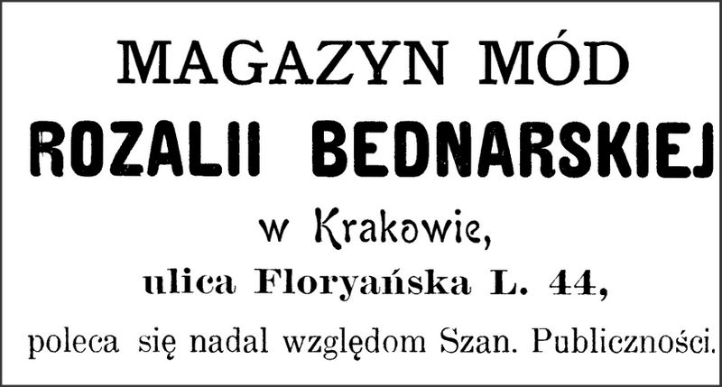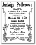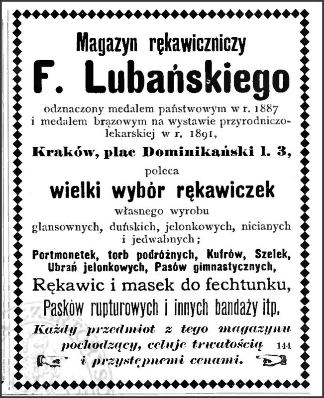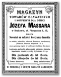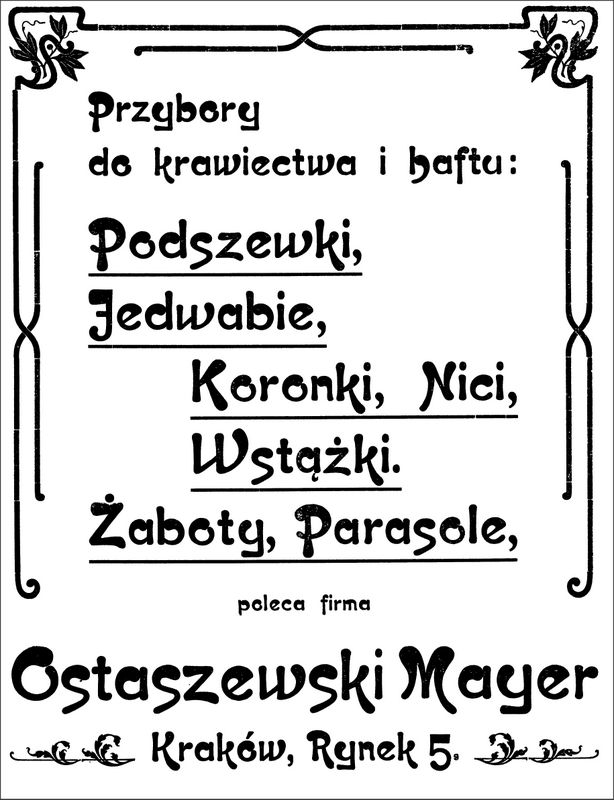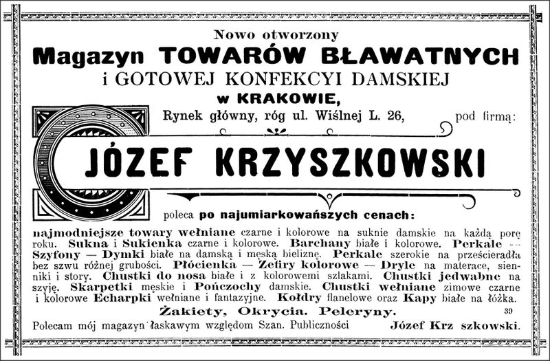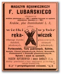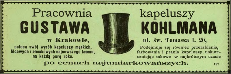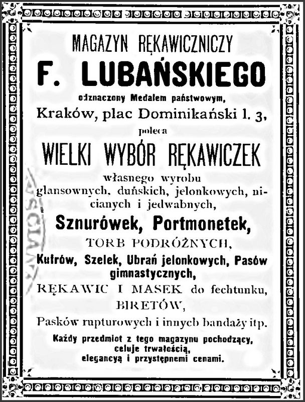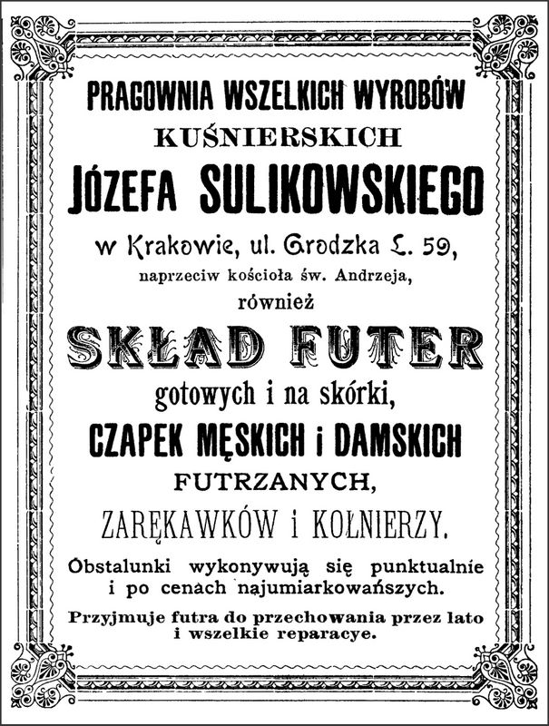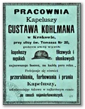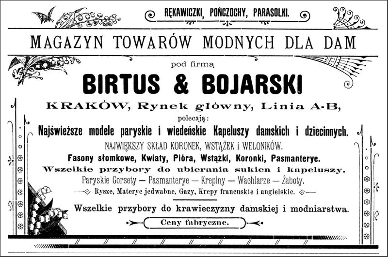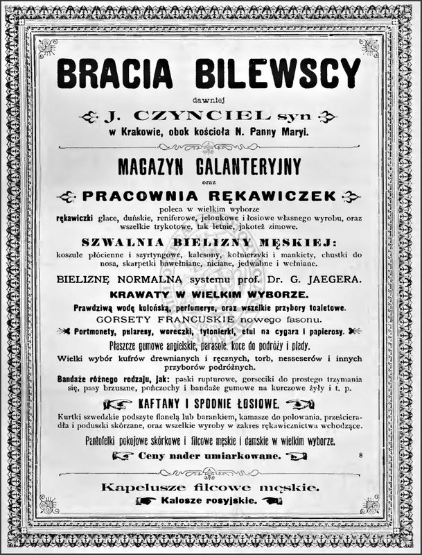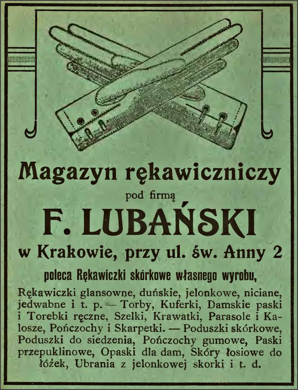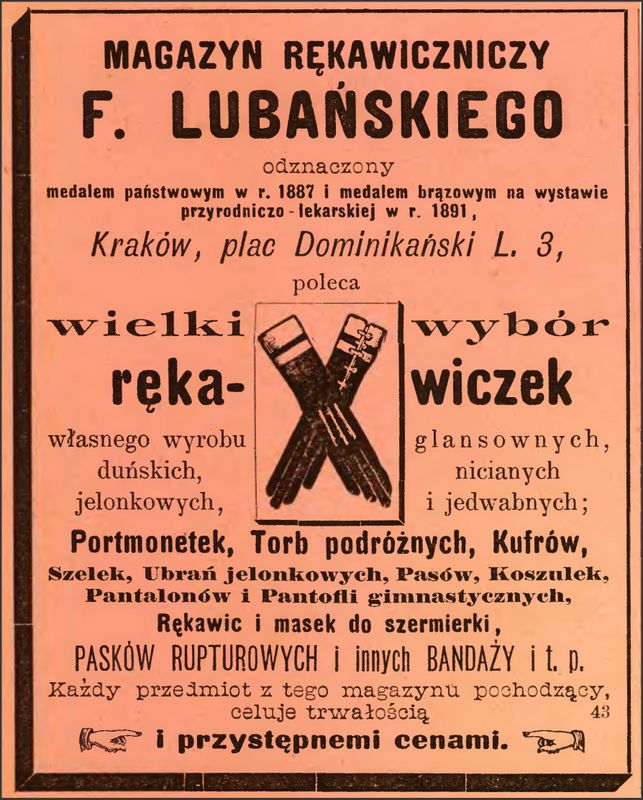 Galeria przedstawia reklamy i ogłoszenia z przełomu XIX i XX wieku zawarte w Kalendarzu Krakowskim Józefa Czecha 1886-1915. Reklamy prezentują akcesoria modowe dla pięknych dam i zacnych gentlemanów. Widoczne są na nich wszystkie dodatki, które pozwalały czuć się elegancko i dystyngowanie na krakowkisch ulicach. Wsród nich parasolki, kapelusze, czapki, rękawiczki, portmonetki.