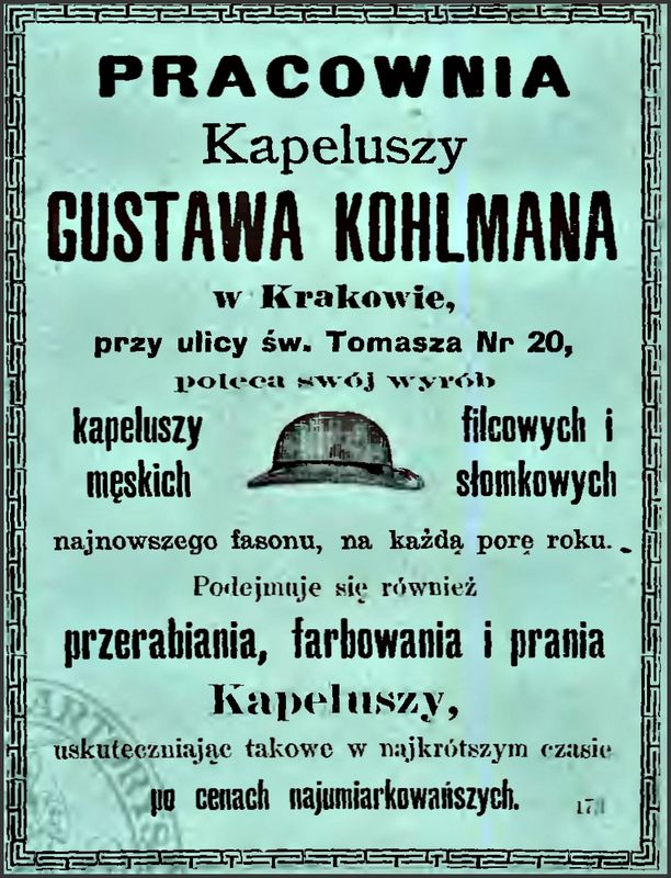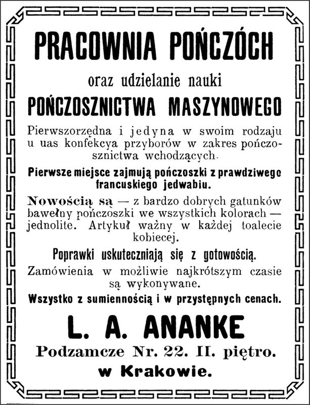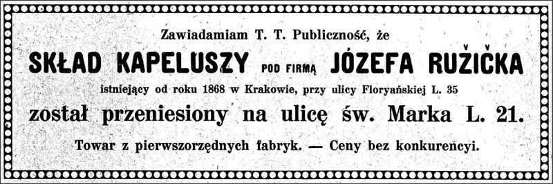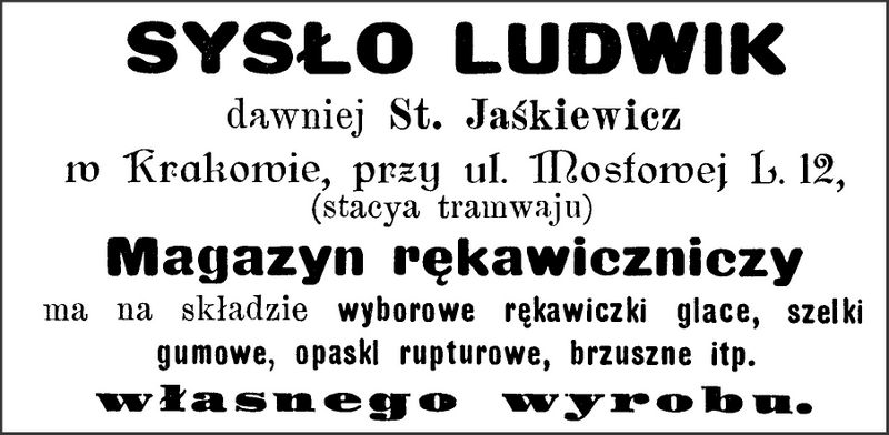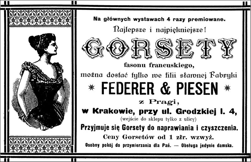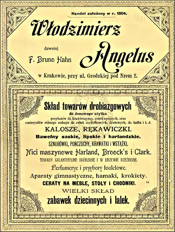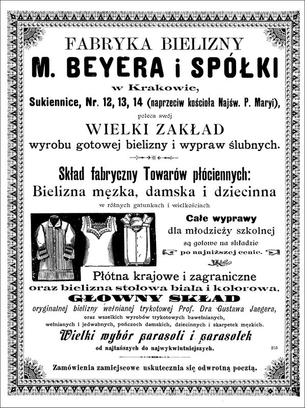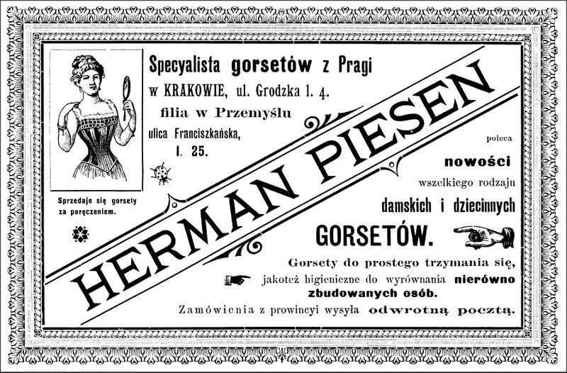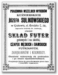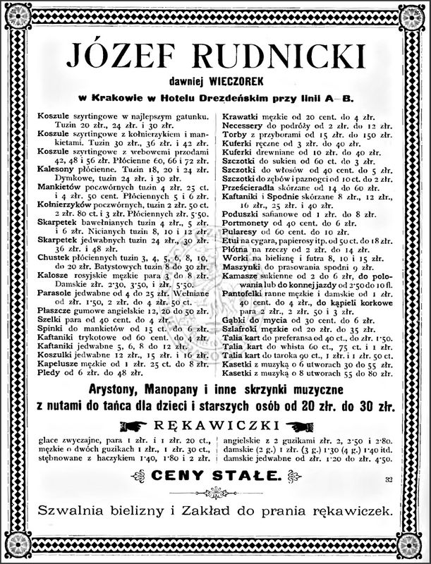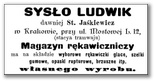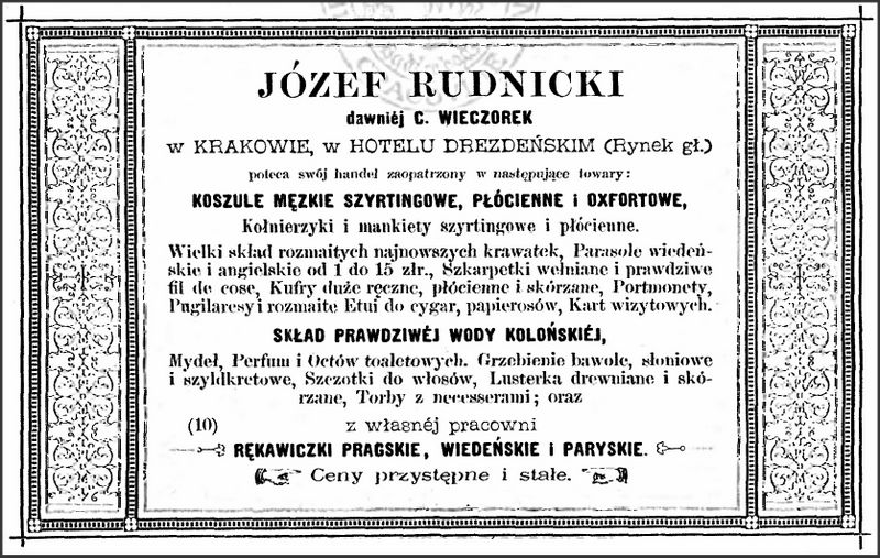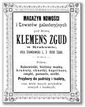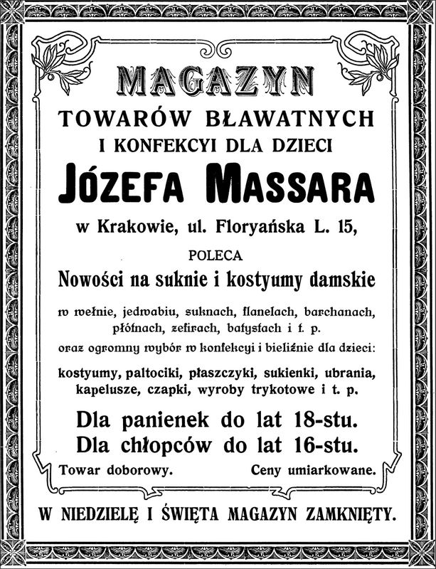 Galeria przedstawia reklamy i ogłoszenia z przełomu XIX i XX wieku zawarte w Kalendarzu Krakowskim Józefa Czecha 1886-1915. Reklamy prezentują akcesoria modowe dla pięknych dam i zacnych gentlemanów. Widoczne są na nich wszystkie dodatki, które pozwalały czuć się elegancko i dystyngowanie na krakowkisch ulicach. Wsród nich parasolki, kapelusze, czapki, rękawiczki, portmonetki.