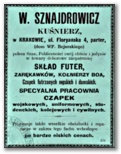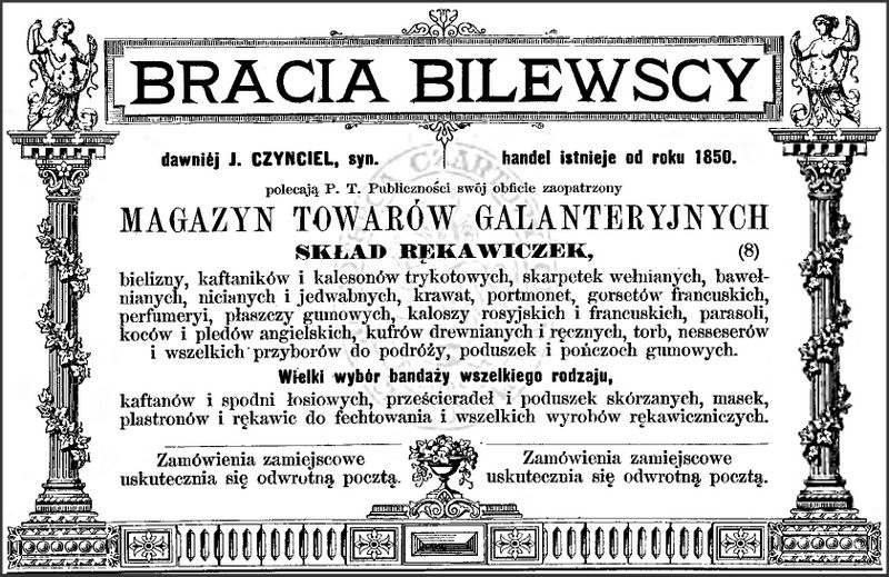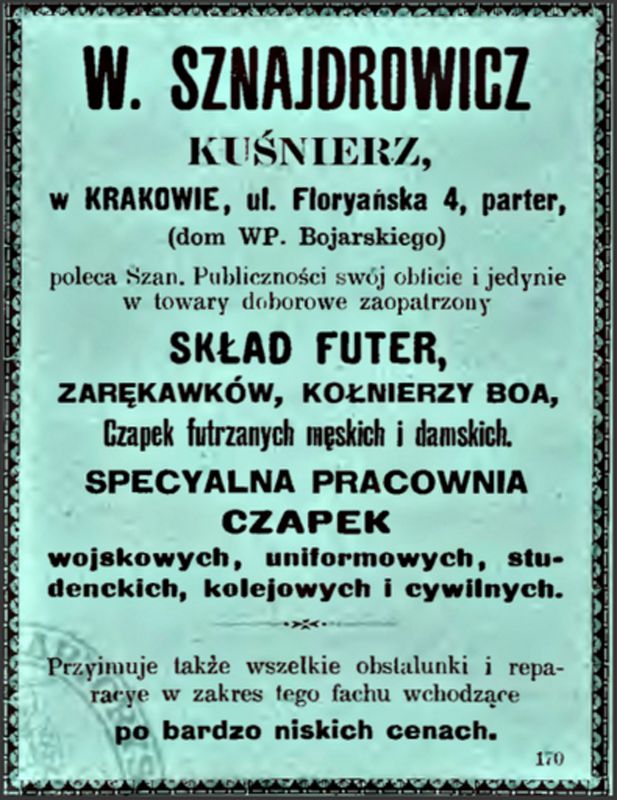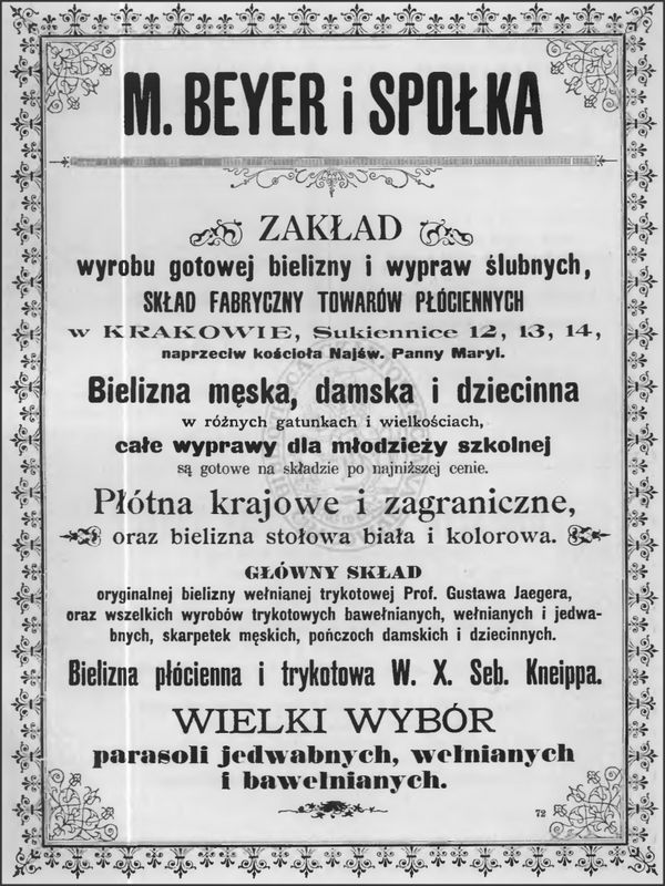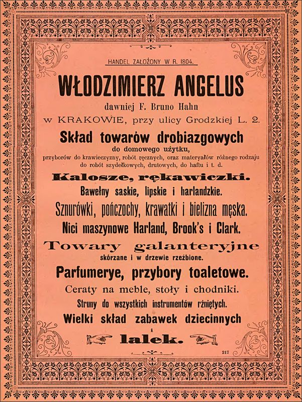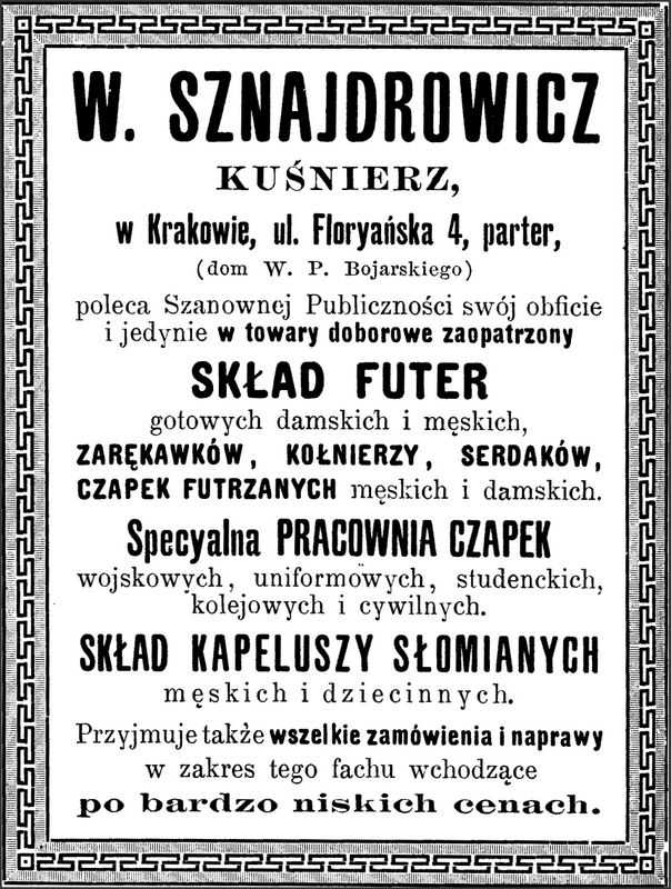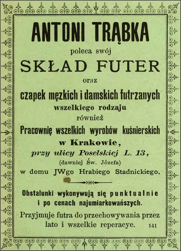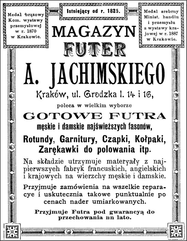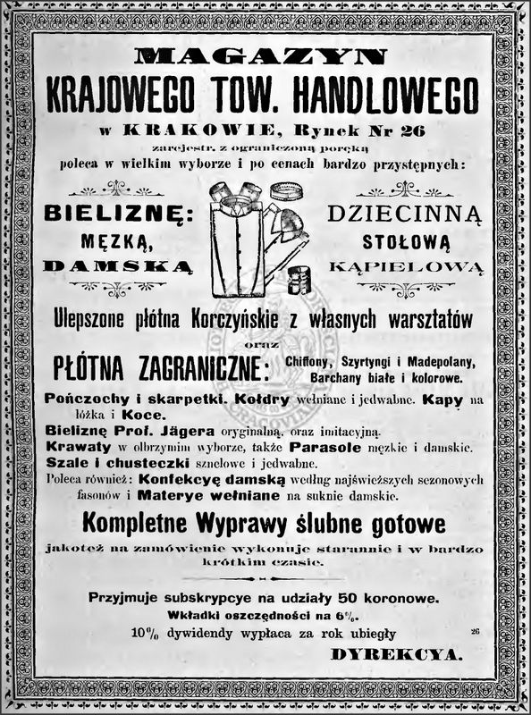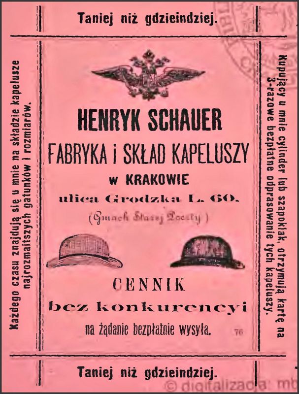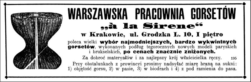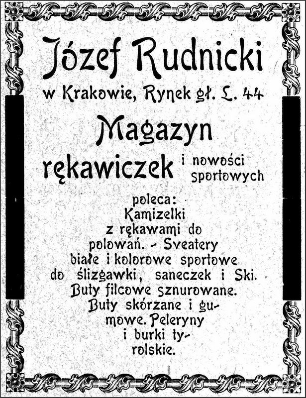 Galeria przedstawia reklamy i ogłoszenia z przełomu XIX i XX wieku zawarte w Kalendarzu Krakowskim Józefa Czecha 1886-1915. Reklamy prezentują akcesoria modowe dla pięknych dam i zacnych gentlemanów. Widoczne są na nich wszystkie dodatki, które pozwalały czuć się elegancko i dystyngowanie na krakowkisch ulicach. Wsród nich parasolki, kapelusze, czapki, rękawiczki, portmonetki.