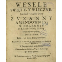 Wesele święte, y wieczne, szlachetnie urodzoney Panny Zuzanny Amendowney; w Krakowie, w kościele Świętey Barbary w niedzielę zapustną, dnia 5 Marca Roku 1628 Bogu poślubioney. Kazaniem X. Ad. Makowskiego Societatis Jesu ogłoszone: Y ku zbudowaniu pospolitemu, za dozwoleniem Starszych, y Urzędu Duchownego do druku podane. W drukarniey Andrzeia Piotrkowczyka Typographa króla J. Mci 1628 - Makowski, Adam (1575-1655)Wesele święte, y wieczne, szlachetnie urodzoney Panny Zuzanny Amendowney; w Krakowie, w kościele Świętey Barbary w niedzielę zapustną, dnia 5 Marca Roku 1628 Bogu poślubioney. Kazaniem X. Ad. Makowskiego Societatis Jesu ogłoszone: Y ku zbudowaniu pospolitemu, za dozwoleniem Starszych, y Urzędu Duchownego do druku podane. W drukarniey Andrzeia Piotrkowczyka Typographa króla J. Mci 1628 - Makowski, Adam (1575-1655)