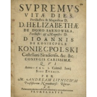 Supremus vitae dies Perillustris et Magnificae D. Helizabethae de domo Sarnowska Perillustr. et Magnifici D. D. Joannis de Koniecpole Koniecpolski Castellani Siradiensis etc. etc. coniugis carissimae. Qui anno 1642 5 Calend. Junij sibi evenit. Per M. Andream Lipnicum professorem Novoduorsc. Rhetor. ad perennem memorabilis posteritatis, recordationem promulgatus - Lipnicivm, Andream; Lipnicki, AndrzejSupremus vitae dies Perillustris et Magnificae D. Helizabethae de domo Sarnowska Perillustr. et Magnifici D. D. Joannis de Koniecpole Koniecpolski Castellani Siradiensis etc. etc. coniugis carissimae. Qui anno 1642 5 Calend. Junij sibi evenit. Per M. Andream Lipnicum professorem Novoduorsc. Rhetor. ad perennem memorabilis posteritatis, recordationem promulgatus - Lipnicivm, Andream; Lipnicki, Andrzej