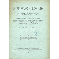 Sprawozdanie "Zjednoczenia" Towarzystwa młodzieży polskiej kształcącej się w wyższych zakładach naukowych w Krakowie za rok 1908/9